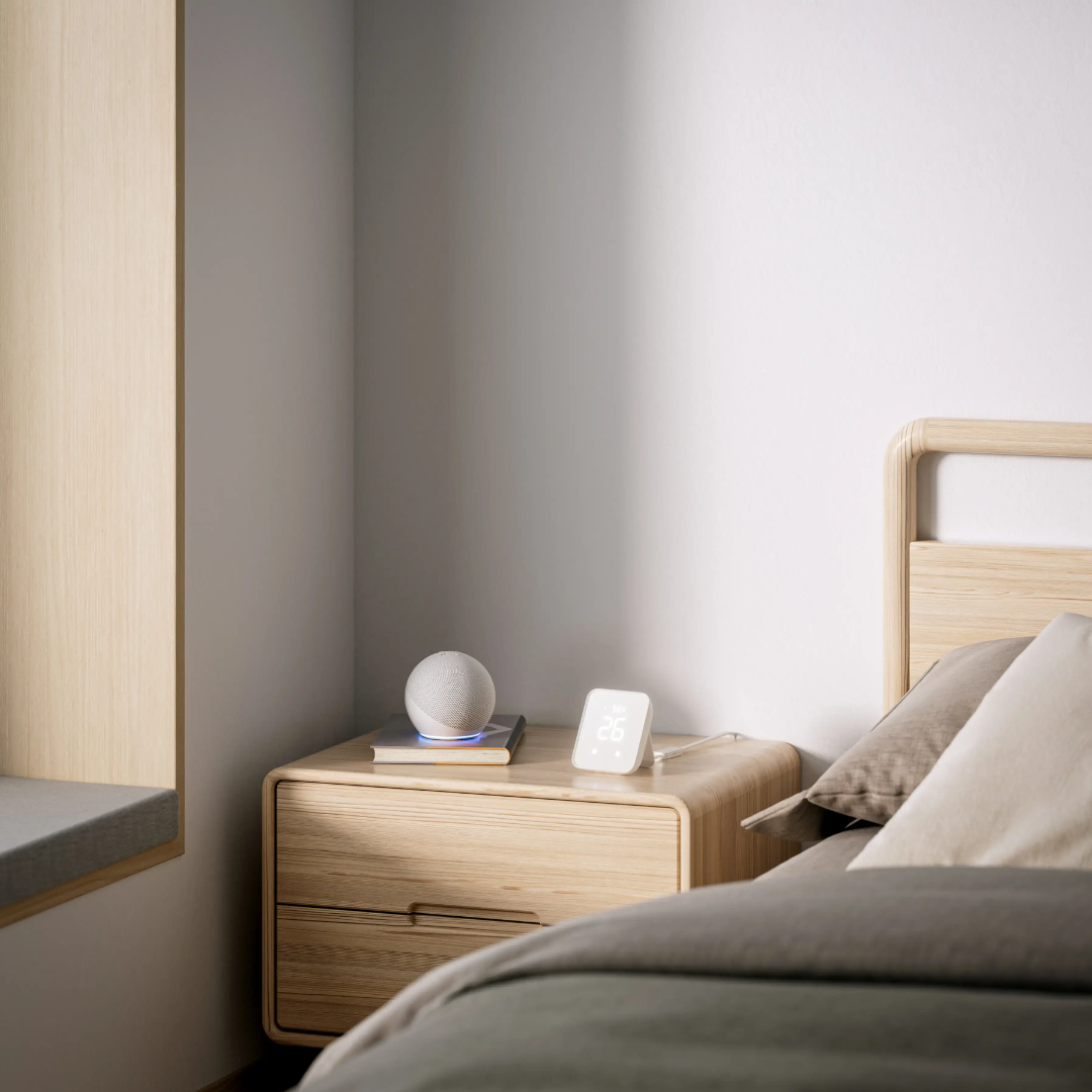 スマートリモコン本体に温湿度センサーが内蔵されていると、Wi-Fiチップの熱の影響を受け誤差が生まれる場合があります。温湿度センサーをコード部分に内蔵することで、より精確な温湿度を測定し、室内温度の調節の自動化がより的確になります。また、アラート機能も付きで、 温湿度の異常、今すぐわかる。外はアプリ通知でお知らせ、うちはハブ2本体から警告アラートを鳴らします。どこにいても、部屋の温湿度に異常があれば、すぐにお知らせします。