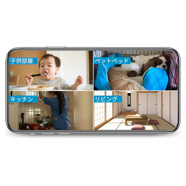 マルチビュー機能で、各部屋に設置したカメラの画面をひとつの画面に表示。カメラの操作画面をいちいち切り替える必要はなく、一目で子ども部屋、リビング、キッチン、ペットの様子が分かります。