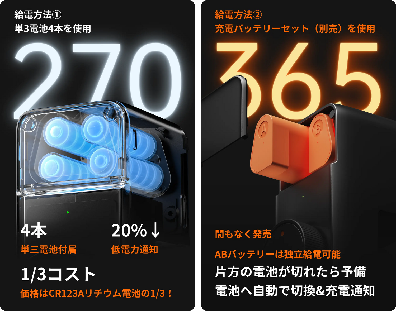 さらに、充電式バッテリー(別売)バッテリー寿命約365日、両サイド独立給電&リレー充電可能。