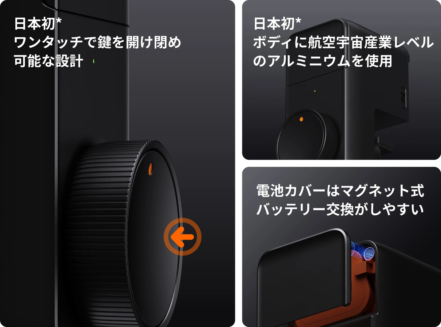 ワンタッチで鍵を開閉できるクイックキーの搭載で、毎年約3650回(※1日あたり10回鍵の開け閉めを行なう場合)行なっている鍵の開閉から解放されます。また、航空宇宙産業レベルのアルミニウム合金を使用します。マグネット式の電池カバーを採用しているため、簡単に電池交換ができます。